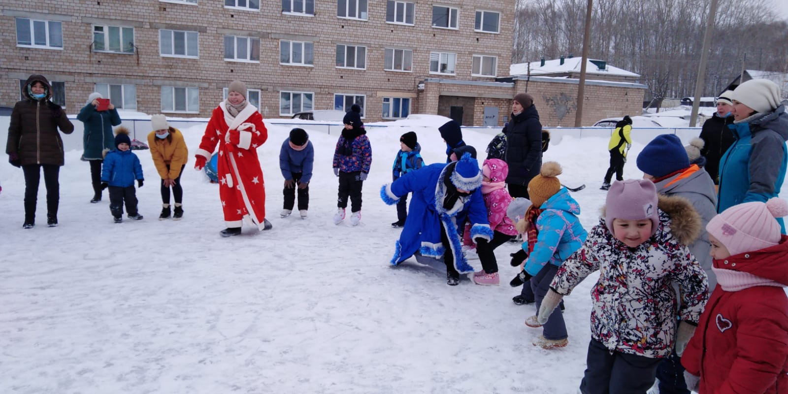 На ледовый каток на старт вышли две команды: команда "Мороз красный нос" и команда «Мороз синий нос».